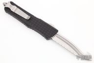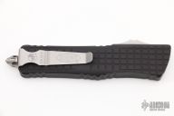 The Microtech Combat Troodon's is one of the largest dual action OTFs (Out The Front) knives available today, the Combat Troodon is the larger version of the Microtech Troodon. Hitting the ruler at almost 10 inches in total length with a 4 inch blade the combat troodon is a formidable battle ready tool, featuring CNC cut jimping on all faces of the handle and a larger slider for easy firing and retracting of the blade while wearing gloves.