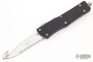 The blade of the Combat Troodon has been totally re-designed with extra long blood grooves and thicker blade stock, along with an actual carbide tipped glass breaker at the bottom of the handle that doubles as the pocket clip securing screw. This is the magnum sized dual action OTF that all else fear. Comes with original box and papers. Excellent condition. Dated 08/2021 and S/N 0016.