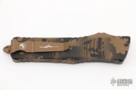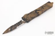 This Signature Series Troodon OTF automatic features a double edged camo blade with partial serrations. The handle is composed of camo aluminum with a stainless steel clip. Glass breaker. S/N #012, dated 08/2022. Comes with original box and papers. Excellent condition.