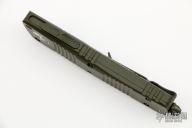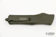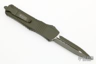 This Combat Troodon OTF automatic features a cerakote finish OD Green coated D/E blade with one fully serrated edge. The handle is composed of a OD aluminum frame. Stainless steel clip. Glass breaker. 08/2022, S/N 39778. Comes with original box and papers. Has a couple light scuffs, excellent condition otherwise.
