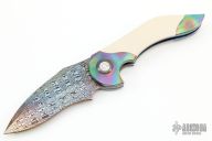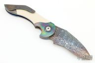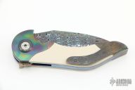 This Dressed Føniks Linerlock Flipper by Glenn Are Hovin features a bronzed Damasteel blade with false top edge and flipper. The handle has orange peel finished and anodized titanium bolsters, front and rear, custom milled pivot with bronzed Damasteel pivot collars, ivory paper micarta scales, anodized titanium liners with jeweled interiors, mokuti backspacer, tip up bronzed Damasteel pocket clip. This knife's only hardware visible is the pivot, every other screw on the knife is hidden, pretty impressive and clean. Nice detent, lockup and blade seating. Comes with zippered case. New from maker!