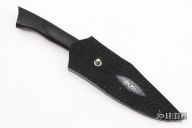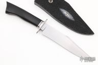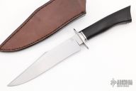 This "Tigress" by Mastersmith Haley DesRosiers was one of her Journeyman Smith Test knives. It features a hand rub satin finished blade with false top edge, .177" blade stock and 1.189" blade depth, hidden tang construction. The handle has a stainless steel guard with black spacers, African Blackwood grip with carved butt. Comes with a black leather sheath with stingray skin overlay and belt stud. Comes with a zippered case and COA dated 2011. Has a few very fine scratches, otherwise excellent condition.