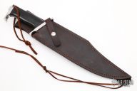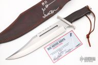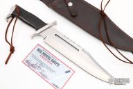 This RIII Bloodline Edition by Gil Hibben and his sons is a handmade full-sized replica of the knife designed and made by Gil Hibben for use in the movie "Rambo III". It features a double stainless guard and pommel with Macassar Ebony grip, hidden tang construction. The blade is satin finished with mirror polished clip, sharpened top edge, fileworked spine, .310" thick and 2.245" blade depth. Includes a brown leather sheath and a zippered case. Includes a metal COA signed by Gil and his sons verifying the authenticity of the knife.  The knife is #11. Excellent condition.