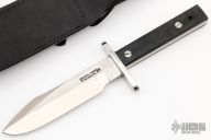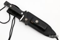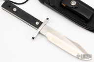 This Model 17 Astro by Randall features a satin finished spear point blade with false top edge, .221" blade stock. 1.275" blade depth, full tang construction. Black linen micarta scales, fastened with removable stainless steel bolts. A slot in the heavy tang and matching hollow inside the handle may be used to carry matches, fishhooks, line and other survival items. The Model 17 was especially designed for the seven Mercury astronauts, who carried them on America's first manned space flights. Astronaut Gordon Cooper did the final design, and two of these historically valuable knives are on display in the Smithsonian Institution. Includes black leather sheath with stone and original paper wrapping. New from maker.