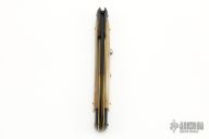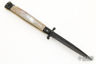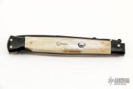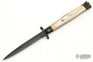 This 11" Swing Guard Auto by Frank Beltrame features a black bayonet ground blade with false top edge. The handle has black stainless steel bolsters, front and rear, honey horn scales, brass liners, black stainless spring. Excellent condition.