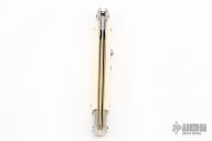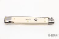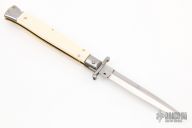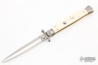 This 11" Swing Guard Auto by Frank Beltrame features polished dagger ground blade with false top edge. The handle has stainless steel bolsters, front and rear, imitation ivory scales, brass liners, stainless spring. Excellent condition.