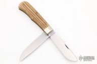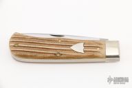 This Trapper by Great Eastern Cutlery features two satin finished blades both with nail nicks and false top edges. The handle has nickel silver bolsters, micarta covers with nickel silver escutcheon, brass liners, and stainless steel springs. Excellent condition.