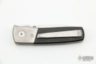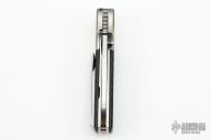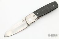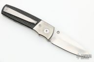This linerlock by Sebastian Larsson features a hand rub satin finished blade with notched thumbrest and single thumbstud. The handle has orange peel finished titanium bolsters, liners and tip up clip, carbon fiber scales. Nice detent, lockup and blade seating. #4 of 9 inside frame. Excellent condition.