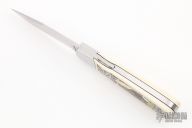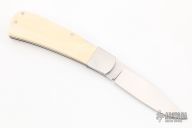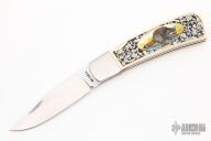 This Lockback by Richard Bridwell features a hand rub satin finished blade with nail nick. The handle has dovetailed stainless steel bolsters, stainless steel liners and backspacer, mammoth ivory scales with scrimshaw. Has some light scratches, otherwise excellent condition.