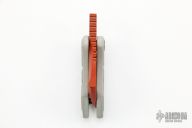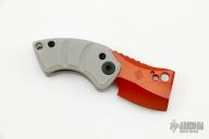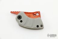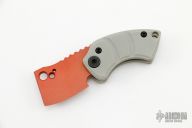 This Korvid Friction Folder by Justin Koch of Koch Tools features a orange blade with notched thumbrest and friction bar. The handle has gray G-10 scales over a titanium barrel spacer. Lanyard hole in pommel. Comes with COA dated 1/21.  Excellent Condition.