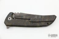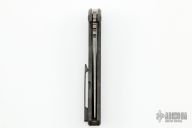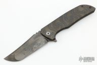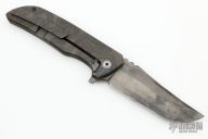 This Bold by Michael Zieba features a distressed blade with notched thumb rest and flipper. The handle is comprised of a blasted and flamed titanium frame over matching back spacers with lanyard pin. The titanium tip up clip is positioned for right hand carry. Includes padded and zippered case. Has some light scuffs and scratches. Great condition otherwise.