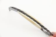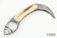 This "Claw" by Wayne Valachovic features a Damascus blade with fileworked sping and tang, .177" blade stock and .662" blade depth, full tang construction with mammoth ivory scales. Comes with a custom curly Tiger Oak wooden display case. Excellent condition.