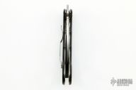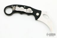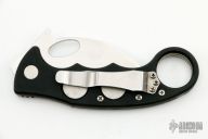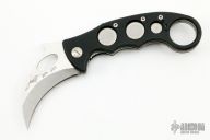 This Ernie Emerson Karambit has a satin finished hawkbill chisel ground blade with notched thumbrest, thumbhole and wave feature. Handle has black G-10 scales with titanium liners and black G-10 backspacer, and tip up stainless clip. This knife has been hand ground by Ernie. Excellent condition, comes with a zippered case. #055.
