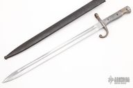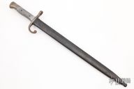 This is a scarce Argentine Contract Mauser M-1891 Bayonet constructed with Aluminum grip panels. Bayonet and scabbard are marked with matching serial number A5429 with RA stamped on both, for República Argentina. The almost 16" blade is in excellent condition, . "MODELO ARGENTINO 1891 M1661" on one side of the blade and "WEYERSBERG, KIRSCHBAUM & CO, SOLINGEN" on the other side. The aluminum grip scales were part of an effort to lighten the bayonet. The grip metal is an alloy of aluminum, with 6 percent copper. Argentina opted for the 15.75 inch blade, after seeing that Chile was going to adopt a shorter (10-inch blade) bayonet for their Mausers. However, the prototype bayonets turned out heavier than the Argentine's liked, so they made a number of design changes (thinner blade, slimmer hilt, and others). They went ahead with the brass grip scales, initially, so as not to further delay production. Brass-gripped bayonets were made 1892–93. Production switched to aluminum grip, mid-1893, after producing 40,000 brass grip bayonets. 190,000 aluminum grip bayonets were made, 1893–1898. Has some scratches and a couple dings, otherwise excellent condition for its age. The scabbard has "P3116" on the front..