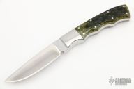 This knife by "JJ" (please let us know if you know who this maker is, the mark is "JJ" inside an oval) features a satin finished blade with .173" blade stock and .825" blade depth, full tang construction. The handle has stainless steel bolsters with jigged bone scales and white liners. Comes with a zippered case. Has a few light scratches, otherwise excellent condition.