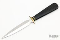 This Dagger by Pat Crawford features a mirror finished double edged blade with .168" blade stock and .714" blade depth, hidden tang construction. The handle has a brass guard and black linen micarta grip with black and brass spacers. Has a couple light scratches, otherwise excellent condition. Comes with a zippered case.