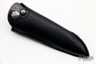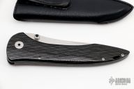 This button lock folder by TiNives features a polished blade with false top edge and dual thumb studs. The handle is multi-color coated aluminum frame with button and lanyard hole. Excellent condition. Comes with a zippered case and black leather pocket sheath.