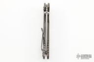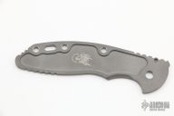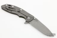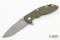 This XM-18 Flipper by Rick Hinderer Knives features a 3.5" working finished blade, notched thumbrest and flipper, dual thumbstuds. The handle has a green G-10 scale, and working finished titanium handle/clip. Clip can be mounted for tip up or down carry. Nice lockup, seating, and detent. Comes with original box, extra hardware and an extra titanium scale. Excellent condition.