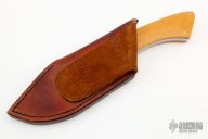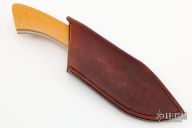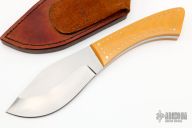 This Iron Butterfly Skinner by Howard Viele features a hand rub satin finished blade with .241" blade stock and 2.220" blade depth, full tang construction. The handle has yellow Westinghouse paper micarta scales with black liners and 40 nickel silver pins. Includes a brown leather sheath. Excellent condition. Comes with a zippered case.