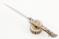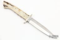 This Boot Knife by Pat Crawford features a mirror finished double edged blade with .167" blade stock and .793" blade depth, full tapered tang construction. The handle has nickel silver guard, stag scales grip with red liners. Has a fileworked tang. Comes with a zippered case. Has a couple light scratches, otherwise excellent condition. Made in 1978 and is #40