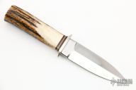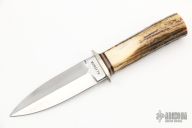 This boot dagger by Morseth knives features a double edged satin finished laminated steel blade with .183" blade stock and .976" blade depth, hidden tang construction. The handle has a nickel silver guard with a stag grip, red/black/white spacers. Comes with a zippered case. Has a few light scratches, otherwise excellent condition.