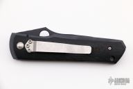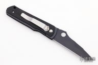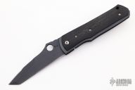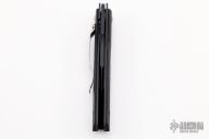 This folder from Allen Elishewitz features a black finish blade with notched thumbrest and thumb hole. The handle has black titanium frame and liner, black G-10 scales and backspacer. Stainless steel clip positioned for tip down carry. Has some scuffs, otherwise excellent condition. Comes with a soft pouch.