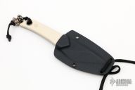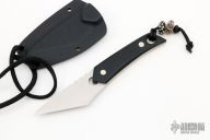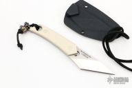 This Special Order Kiridashi by Alan Harvey features a satin finished chisel ground blade with notched thumbrest, .164" blade stock and 1.080" blade depth, full tapered tang construction. The handle has a tuxedo theme with black and white paper micarta scales and liners. Comes with a kydex neck sheath. Excellent condition.