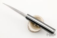 This Special Order Kiridashi by Stefan Stromberg featuresa a satin finished blade with .152" blade stock and 1.210" blade depth, full tang construction. The handle has black linen micarta scales with black and white G-10 liners, polished stainless steel pins. comes with a zippered case and COA dated 4/19/19. Excellent condition.