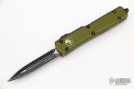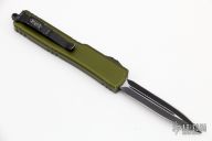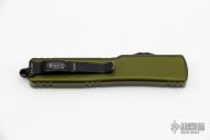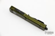This UTX-70 OTF automatic features a D/E black finish blade with a standard edge. Stainless steel clip. OD Green aluminum frame. S/N 34871. Dated 06/2022. Comes with original box and papers. Has some light scuffs and scratches, has been resharpened, otherwise good condition.