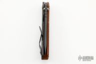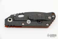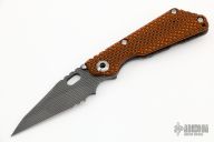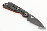 This SNG framelock folder by Mick Strider features a Grid Pattern multi-ground pike grind partially serrated blade with notched thumbrest and thumbhole. The handle has a black/orange gunner grip pattern black G-10 and flamed titanium frame and tip up titanium clip. Includes a "Lock Bar Stabilizer" for maximum reverse lock retention. Nice detent and lockup, blade is off center though. New condition.  Comes with a zippered case.