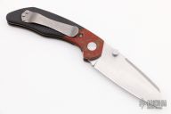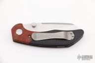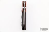 This Model 75 from Jesse Jarosz has a stone wash finish, multi-ground blade with satin bevels, dual thumbstuds and notched thumbrest. Handle has red bolsters, with carbon fiber scales, tumbled and anodized titanium liners, black G10 spacer with lanyard pin, and tumble finished tip up titanium clip. Nice crisp detent, tight lockup, and centered blade seating. Has a fair amount of scratches on the blade. Comes with makers card. Great condition.