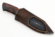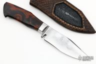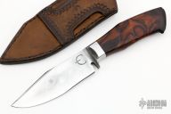 This Integral EDC Hunter by Juan Espada features a satin finished blade with false top edge, .240" blade stock and 1.375" blade depth, hidden tang construction. The handle has a desert ironwood burl grip with buffalo horn butt. Comes with a hand tooled brown leather sheath with stingray skin inlay. Comes with a zippered case and hand written COA. New from maker!