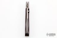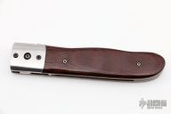This linerlock by Frank Dilluvio features  a satin finish tanto blade with a single thumbstud. The handle features stainless steel bolsters with dovetail micarta scales over titanium liners and a micarta backspacer. Jewewelled liner interior. Comes with a box. Has scuffs and scratches, great condition.