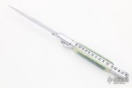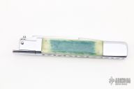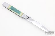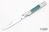 This Picklock Auto by Agasi Hambartsumian of Armenian Doctor Knives features a mirror polished bayonet ground blade with a false top edge and etching of a warrior on horseback. The handle has a polished stainless steel frame with fileworked stainless steel backspacer, dyed bone scales with brass pins. New from maker.