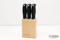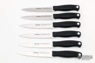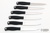 This set of Kershaw Steak Knives model 9922-7 comes with six knives and a wood holding block. Once you try these knives you will not want to eat your steak with any other knife. What is noticeable about these knives right from the start is their comfortable handles and their blade length. This grip and extra length gives you extra dexterity for precise cutting when eating your steak, adding more enjoyment to your overall culinary experience.