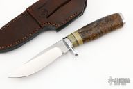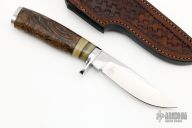 "In 1973 I started working for the British Columbia government as a wildlife control officer, hunting problem wildlife. Later I worked as a conservation officer. All my life I have hunted, fished, trapped and gunsmithed as a hobby, and knives have always been an important part of my life, from my bicycle trap line as a kid, to skinning problem wildlife when I worked as a wildlife control officer, to dressing the moose or deer I hunted for the freezer. I made my first knife in 1976, and in 1996 my wife Judy and I decided to go into the knife business full time. I make mostly upscale working hunting knives with a bowie or miniature now and again. Each knife is a unique combination of materials. Although I have used many different steels, I have found 440-C to be the most versatile. Heat treated to 57 Rockwell for optimum edge retention and ease of sharpening, this steel has proven itself in both working and collector knives. Other steels will be used for special order, and I enjoy using Damascus for collector pieces."