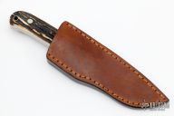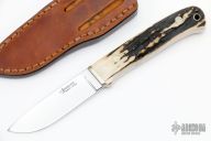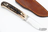 This Drop Point Hunter by Steve Johnson features a mirror polished blade, .125" blade thickness and .892" blade depth, full tapered tang construction. The handle has a nickel silver guard and stag scales. Mirror polished tang. Comes with a brown leather sheath and zippered case. Great look and feel. Excellent fit and finish. Excellent condition.