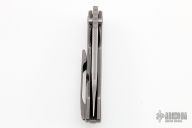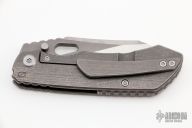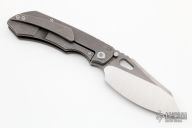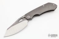 This Evolution 3.0 by Custom Knife Factory features a satin finished blade with notched thumbrest and thumbhole. The handle has a stonewashed bark finished titanium frame with a matching tip up clip and backspacer. Comes with velcro case and COA. Nice detent, lockup and blade seating. Excellent condition. #478 and dated 8-22