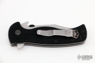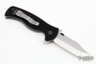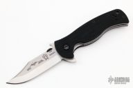This Sheepdog from Emerson Knives features a stonewashed blade with notched thumbrest and flipper. Knife can be opened using the thumb disk, wave feature or flipper. The handle is comprised of black G10 scales over titanium liners with black barrel spacers and black stainless steel reversible pocket clip positioned for (right or left handed) tip up carry. Excellent condition. #0139