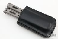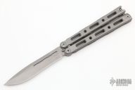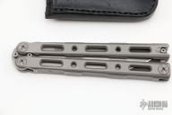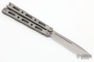 This Model 85 Balisong by Benchmade features a tumble finished blade. The handle is comprised of an integrally constructed, skeletonized titanium frame with bead blast finish. Spring-loaded T latch on pommel. Comes with original box, sheath and papers. Comes with a custom black leather sheath as well. Excellent condition.