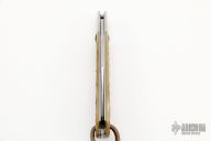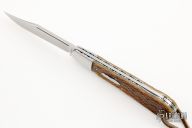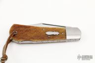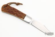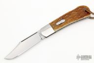 This lockback by Luke Swenson features a hand rub satin finished clip point blade with swedge and long pull nail nick. The handle is comprised of stainless steel bolsters, jigged bone covers, stainless steel arrowhead escutcheon, stainless steel fileworked liners and a stainless steel lockbar with crosshatch pattern on the lock relief. Comes with zippered case. Excellent condition.