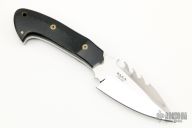 This is 1 of 200 knives made for the National Independent Cutlery Association(NICA) by Gil Hibben. Mirror finished blade with sawteeth on spine. Full tang construction with blade thickness of .195" and depth of 1.756". Black linen micarta scales with mosaic pins. Fancy filework around entire tang. Excellent condition. Comes with a zippered case.