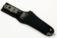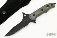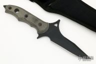 Ontario Bram Abaniko-5 Fixed Blade Knife Marked as 296 out of 800. Designed by Bram Frank the renowned martial arts practitioner. It features a black coated blade with sharpened top edge, notched thumb and finger rests, .192" blade stock and 1.110" blade depth, full tang. The handle has black linen micarta scales with white liners and a lanyard hole. Comes with a black nylon MOLLE sheath. Made in USA. Excellent condition.