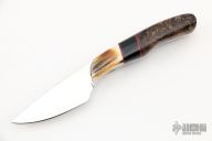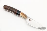 This Knife by Bill Akers of Backwoods Custom Knives features a mirror polished blade with fileworked spine, .110" blade stock and .889" blade depth, full tang construction. The handle has stag bolsters, burl wood scales with red and black spacers. Has some light scratches, otherwise excellent condition.