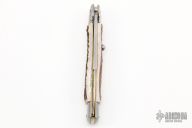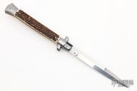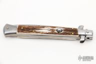 This 11" Swivel Bolster Auto by Frank Beltrame features bayonet dagger ground blade with false top edge. The handle has stainless steel bolsters, front and rear, stag scales, brass liners, stainless spring. Excellent condition.  Comes with a zippered case.