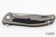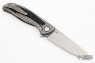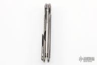 This F95NL framelock from Shirogorov features a flat ground tumble finished blade with notched flipper. The handle has a tumble finished titanium frame with a Monkey Edge Frag Pattern black G-10 inlay complimented by a tumbled titanium tip up clip and a single titanium barrel spacer at the butt along with a lanyard hole. Excellent lockup, strong detent, and nice seating. Includes the original box and papers. Excellent condition.