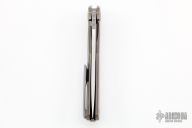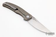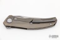 This Quantum by Shirogorov features a blasted blade with notched thumbrest and flipper. The handle has a blasted and anodized titanium frame, backspacer, tip up titanium clip with hidden screws. Rides on MRBS, nice detent, lockup and blade seating. Comes with original box and COA. Excellent condition.