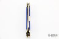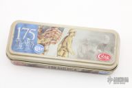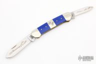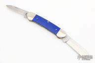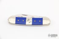 This canoe slipjoint by Case was made to celebrate the 175th Anniversary of Colt. It has polished blades with nail nicks, nickel silver bolsters, blue covers, brass pins and liners, stainless steel springs. Comes with original box and papers. Excellent condition.