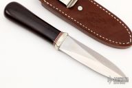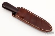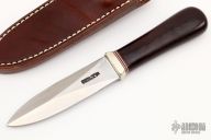 This Model 24 Guardian by Randall Made Knives features a satin finished double-edged blade with notched finger rests, .160" blade stock and .991" blade depth, hidden tang construction. Black linen micarta grip with red/white/blue spacers and a nickel silver guard. Both edges of the blade are sharpened with 1" of thumb notches. This model was designed in 1978 for use by police, undercover agents and law enforcement personnel for self-protection and as a back-up weapon. Comes with a brown leather sheath w/ boot clip. Excellent condition.