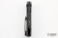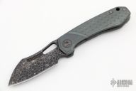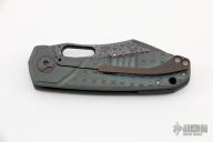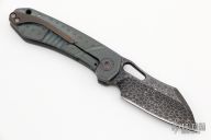 This H.S. Possum, Possum Leg by Jason Stout and Jeremy Horton features a chisel ground Dragon Skin blade with a fuller, thumbhole and flipper. The handle has a bronze/green tumble/anodize finished titanium frame with tip up pocket clip and a micarta backspacer. Nice detent, lockup and blade seating. Comes with COA, and zipper case. New from Maker!